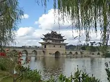 - 🌍 Double Dragon Bridge (双龙桥 Shuanglong qiao). The 17-span bridge, now standing in the middle of a pond, as most of the waters in the Lin'an River has been diverted elsewhere. The tourist train makes a short stop nearby. free.