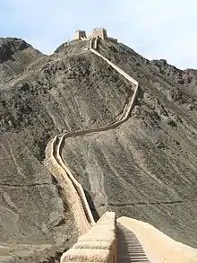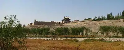 Known as the 'mouth of China' because of its position at the end of the Great Wall of China where it guarded the western boundary of Ming Dynasty China. The narrow river passage heading southeast from here is known as the Hexi Corridor and is nicknamed the 'throat of China'.
