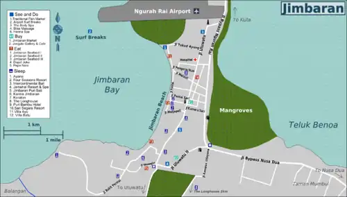 - π Mango Tree Villas (4 km or about 7 min from the airport), β +62 361 701844, villamangotree@gmail.com. 1- and 2-bedroom villas with private swimming pool and garden in Jimbaran village. 350 m to the beach and 100 m to the market and main temple. Breakfast and daily cleaning included. US$140-180.