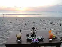 To enjoy a sunset on the beach, there are few better places in Bali. For a cheap beer sitting on plastic chairs, go near the fish cafΓ©. For something more elegant, try PJ's Bar at the Four Seasons, or JBC (Jimbaran Beach Club), just next to it.