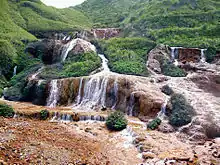 - Gold Waterfall. The substantial Jinguashi rainfall seeps into the mine shafts through cracks in the surface rock, becoming acidulous water after interacting with the pyrite and enargite underground and undergoing oxidation reduction. A natural wonder “Gold Waterfall” has formed where the terrain drops sharply. This is one of the sources of the Yin-yang Sea.