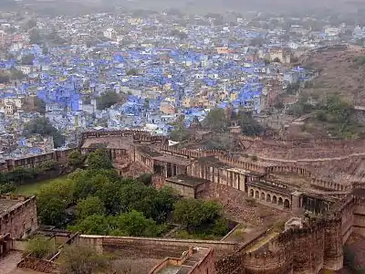 Jodhpur (Hindi: जोधपुर) is the second largest city in the state of Rajasthan. It is called the Gateway to Thar, as it is on the edge of the Thar desert. It is also called the Sun City as the sun shines (bright and hot) almost every day of the year.