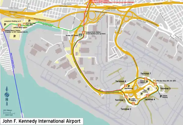 - JFK AirTrain - a people mover system that runs 24 hours daily, connecting all airline terminals, Lefferts Blvd Station (airport parking), and the Federal Circle Station (Car rental & hotel shuttles) for free and $8.00 to enter and to leave through the Howard Beach and Jamaica Stations. The AirTrain runs service to Howard Beach Station to connect with the 'A' train to Brooklyn and Lower Manhattan, and Jamaica Station to connect with the 'E' Train to Queens and Lower Manhattan, the 'J' and 'Z' trains to Brooklyn, Lower Manhattan, and the Long Island Railroad to Penn Station, Brooklyn, or Long Island. The combined LIRR/AirTrain fare to New York City is $18.75 during peak travel hours, or $15.75 for off-peak travel. On weekends, the fare is reduced to $13.00 using the LIRR CityTicket. Elevators are available at Jamaica and Penn Stations. Total time to Manhattan using the subway is 60 minutes; using the Long Island Railroad is 35 minutes. This is sometimes faster than taking a taxi. If you do go to Jamaica and want to reach downtown, the J/Z run above ground over a scenic route passing over the Williamsburg Bridge albeit through some rough neighborhoods, are marginally faster than the E and can be much less crowded during peak times than the E. During AM rush towards Manhattan and PM rush away from it, the 'J' and 'Z' do skip-stop service, meaning that some stations are served by one of these trains. Keep this in mind if you are waiting at one of those stations. If returning to the airport on the A train, make sure the destination signs read Far Rockaway or Rockaway Park. Trains to Lefferts Blvd. do not connect directly to the airport! If you board the wrong train, transfer at any station at or before Rockaway Blvd. If you forget and overshoot, go to the end of the line and either go back to Rockaway Boulevard and transfer for a Rockaway Park- or Far Rockaway-bound A train or take the Q10 bus directly to the airport. As with the 'J' and 'Z' trains, when taking the A train during the overnight hours, be alert of your surroundings as the train passes through some rough neighborhoods. Between midnight and 6 AM, the A train makes local stops, so journey time will be slower at that time of day.