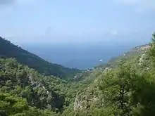 On the approach from Faralya, about 2 km away from the village, there is a dirt road that branches off the main road and leads into the canyon and the coast. However, if you have the smallest bit of love for your car, avoid driving on that road — think of a rocky downslope where the soft topsoil has all been bulldozed. A better option is to park your car in the upper village and take a minibus the rest of the way. Keep in mind that they don't run on a fixed schedule — they're ready to go as soon as you pay; but you may have to wait for one returning from the coast first — and the flat rate of 35 TL is per trip, not per passenger: if you're lucky, you might split the fare with fellow travellers waiting along with you at the stop, but if you're alone you're on the hook for the entire tab. Ask at the grocery store at the upper village for more information.