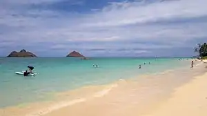 - Lanikai Beach. Lanikai Beach is just past Kailua Beach. Take Kawailoa Rd to Aalapapa Drive. Aalapapa Drive and Mokulua Drive form a large one-way loop. One of Hawaii's most picturesque beaches with fine white sand, exceptionally clear and blue water, and two offshore island known as the Mokuluas. No public facilities, and access is only available by public access walkways. Please respect local residents' property. Also there are parking restrictions in Lanikai on weekends and holidays, in which case it may be best to park at Kailua Beach Park and take a 10-20 minute talk to Lanikai.