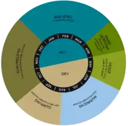 Hot dry season, August to October Hunting time for file snakes and long-necked turtles. White-breasted wood swallows arrive as thunderclouds build, signalling the return of Gunumeleng.