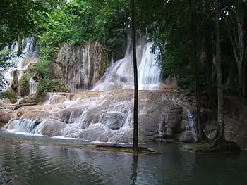 - Srinakarind National Park (อุทยานแห่งชาติเขื่อนศรีนครินทร์). It was made a national park on 23 December 1981. It has an area of 953,500 rai (1,496,800,000 m2). Attractions include Tham (cave) Sawan (ถ้ำสวรรค์), Tham Neramit (ถ้ำเนรมิต), Tham Nam Mut (ถ้ำน้ำมุด), Tham Phra Prang (ถ้ำพระปรางค์), Namtok (waterfall) Huai Mae Khamin (น้ำตกห้วยแม่ขมิ้น). Another area of beautiful natural scenery is the Srinakarind Reservoir, which is right behind the Srinakarind Dam. Unfortunately, there is no public bus service here. The beginning of this waterway is called Lumnam Jone, which is the headwaters of the famous River Kwai. It has some beautiful surroundings and crystal clear water. It is hard to get to: on foot it will take a few hours walk, and by boat it takes around 5 hr from the ferry pier at Srinakarind Dam. Lumnam Jone can only be reached by one tour operator to limit the amount of visitors to the region. The trip takes two days and one night and can only be booked for the first weekend of the month. Some other interesting sights in the area are the Phra That Cave, the Huay Mae Khamin Waterfalls and the Tham Than Lot Cave. The Srinakarind Dam has a nice cafe serving mostly Thai food and is open every day. The area has two main ethnic groups, Thais and Karen. There are several villages of mostly Karen people in Naasuan of Amphoe Sri Sawat. Near the amphoe is a small Mon village. Beyond Ong Sit village and off a side road is a Lao village called Jerot. The villagers originally came here to help clear the forest when the dam was built and ended up settling in the area. Although many of the Karen women do a wonderful job of weaving (sarongs, blouses, bags), there is no local shop that sells these products. Occasionally there will be a house that will have items for sale, but they may be hard to find.