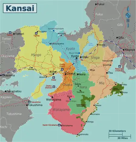 Kansai (関西) is the western region of the main Japanese island of Honshu, second only to Kanto region of Eastern Japan in population. The area is also known as Kinki (近畿) District, literally "near the capital" (referring to ancient capital Nara and Kyoto), and its three big cities — Osaka, Kyoto, and Kobe — as Keihanshin (京阪神).