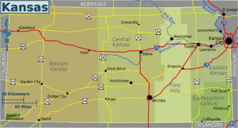 | Central Kansas A mixture of farmland, rolling hills, and man-made lakes, it is a transition zone between the hilly east and the arid west. Home to Wichita, the largest city in the state. |