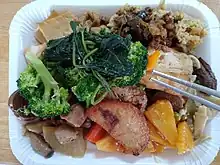 Lunchboxes are common throughout the city, and a choose-your-order buffet take-out are typically NT$50-100. The food is typically fried, with a mix of vegetables and meats.