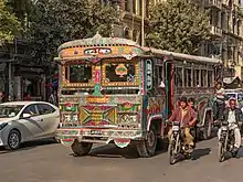 Karachi is dominated by jingle minibuses which move back and forth around Karachi and are extremely cheap but they’re a confusing bet for the visitors, with numbers, destinations and stops poorly marked, and buses are horribly crowded and noisy. Outsiders might be put off by the cramped conditions in the buses, and might prefer travelling in taxis or rickshaw, but the most common method of travelling in Karachi is by bus as they're very cheaper, and less than Rs 50 should be enough to take you from one end of the city to the other. For lack of space, people often sit on the roof, or hang from bars, and are jam-packed inside the bus. They are often operated by reckless drivers who do not follow the rules of the road, endangering many. Women have reserved a separate sitting area in the front of the buses near driver. Apart from the main bus stops, buses are usually hailed from street-level. Buses are seldom marked with destination, instead conductor shout out their destinations. Travellers unfamiliar with Karachi can ask conductor or passengers to let them know where there stop is. Simply politely blurt out the name of your destination to the bus conductor or a friendly looking passenger and they will take care of you. Buses will stop anywhere along the route for you and all have conductors, ask either the conductor of tap on the bus door to signal that you wish to stop.