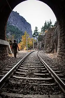 At the southern access on-ramp to the motorway, follow the road signposted to 🌍 Belemedik. The road will turn round to meet the railway under the motorway viaduct and will eventually bring you to the gorge of the Çakıt. Since the most daunting work would have to be managed hereabouts, the engineers of the Baghdad Railway chose this spot for a construction camp, which grew to a town housed a multinational population claimed to be as much as 20,000 at its peak, which included prisoners of war, mainly Commonwealth and French, during the latter episodes of World War I. The village barely has any full-time residents nowadays, and its name is rumoured to be a German-corrupted form of bilemedik, "we couldn't guess", the response of the workers who started digging a tunnel from each end, but failed to meet at the precise midpoint. The ruins of the German town are extensive, with informational signposts and illustrated site plans posted here and there. The ruins include residential and service buildings (e.g., a hospital) and various industrial plants such as a limekiln. Over time, a German cemetery grew on a hillside above the town, not necessarily because of occupational accident-related deaths as the construction activities took about two decades, much longer than predicted. The tunnels 19–14 consecutively extend just next to or a short distance away from the road north along the river gorge, while the tunnel 20 at the southern end of the village is the favourite of photography enthusiasts as the line runs across a grove of plane trees before plunging into the tunnel portal, particularly photogenic in autumn. Past this point, the road degenerates to dirt and starts climbing up the hill: this 20-km section is locally known as the 🌍 German Road (Alman Yolu) or Taşdurmaz ("[even] the stone doesn't balance"), which twists and turns southeast to Kıralan (Hacıkırı), just north of the Varda Bridge, in places right next to the railway line (or its tunnel openings and other infrastructure) and elsewhere a fair elevation above it. This was dug along the cliff face high over the Çakıt gorge to survey the possible routes for the upcoming rail line (no aerial, let alone satellite, support back then), and then served to move construction material around — even this manifestly provisional route required tunnels of its own in a couple spots. It's now a hiking trail (but has no water sources along its entire length), littered at intervals with various abandoned industrial fittings such as rusty pieces of an equipment hauling water up from the river. Sturdy and experienced mountain bikers and motorcyclists are known to do the route, but it's covered in loose scree along its entirety, partially very prone to rockslides (to the extent that a path barely wide enough to let pass a single tire right on the cliff edge is commonly all that is left after a recent avalanche), has gullies washed out a fair bit of its width, and there is nothing between you and the whopping drops to the river below. You should be mad to attempt to cover this route end-to-end in anything remotely coming close to the width of a standard car.