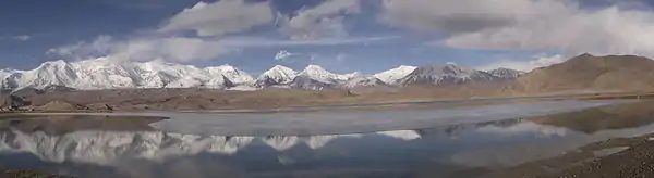 Karakul Lake (meaning "black lake") is approximately 200 km from Kashgar, Xinjiang province, China, in Kizilsu Kirgiz Autonomous Prefecture on the Karakoram Highway, before reaching Tashkurgan and the Khunjerab Pass on the China - Pakistan border. At an altitude of 3600m (though a height of nearer 3,900 m has been quoted), it is the highest lake of the Pamir plateau, near the junction of the Pamir, Tian Shan and Kunlun mountain ranges. Surrounded by mountains which remain snow-covered throughout the year, the three highest peaks visible from the lake are Muztagh Ata (7546 m), Kongur Tagh (7649 m) and Kongur Tiube (7530 m). The lake is popular among travellers for its unreal scenery and the clarity of its reflection in the water, whose color ranges from a dark green to azure and light blue. There are two Kirgiz settlements along the shore of Karakul lake, a small number of yurts about 1km east of the bus drop-off point and a village with stone houses located on the western shores.