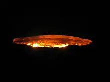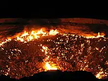 The whole area is rich in natural gas and while drilling in 1971, Soviet geologists tapped into a cavern filled with natural gas. The ground beneath the drilling rig collapsed, leaving a large hole with a diameter of more than 70 m (230 ft) and they decided the best solution was to flare the gas. They hoped the fire would use all the fuel in a matter of days, but the gas is still burning today, more than 50 years later!
