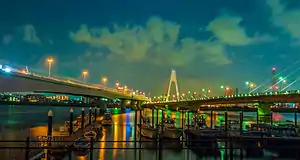 The Metropolitan Expressway (toll road) provides two connections into Kawasaki Ward. The K1 Yokohane Line (a continuation of the Route 1 Haneda Line) connects to Route 409 at the Daishi exit. From the Bayshore Line (aka Wangan Line), a connection can be made at Kawasaki Ukishima Junction to the K6 Kawasaki Line, which runs into Route 409. The Tokyo Bay Aqua Line (toll road), which runs from Kisarazu across Tokyo Bay, also connects to the K6 Kawasaki Line.