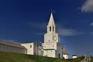 - 🌍 Suyumbike Tower, within Kremlin. Hours as for Kremlin. Söyembikä (various spellings, usually Suyumbike in English; in Cyrillic Сөембикә) was a Tatar princess, and regent of Kazan 1549-1551 during the minority of her son. In 1551 Ivan the Terrible captured the area, and the legend goes that he pressured the widowed princess to marry him. She consented to marry only if he could build the highest tower in Kazan in seven days, which he promptly did; so she jumped to her death from the top of the tower. In truth she was carted off to Moscow, re-married (her third) and died some time around 1554, while the tower was probably built at a much later date. It's 58 m tall, in tiers; it famously used to lean, but was stabilised and straightened in the 20th-century. You can admire it from the outside but you can't enter or climb it. Free.