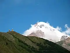 Kazbeg looming over the church