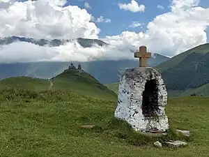 • 🌍 Gergeti Trinity Church (გერგეტის სამების ეკლესია: gehr-geh-t'ees sah-meh-bees ek'leh-see-ah, also known as Tsminda Samebis Church). It towers over the city at a height of 2,170 m (7,120 ft). Free entrance. No smoking, no photography inside the monastery. Decent clothes required. Can become very busy, as crowds of people are brought there by 4x4 taxis.