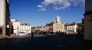 Kelso is a small market town in the Borders region of southern Scotland, with a population of 5639 in 2011. Its name probably derives from Calk Heugh - the "chalk outcrop" which its two rivers cut through. These are the Teviot and Tweed, joining here, both famed for salmon fishing. The town grew up around its Abbey, whose monks farmed the fertile valleys. Its town centre is of a style common in northern France and the Low Countries but rare in Scotland, with a large market square, and Flemish-style buildings. The main reasons to visit are the Abbey and Floors Castle.