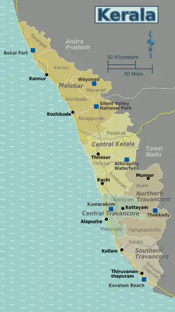 | Southern Travancore Home to the capital city and various monuments, famous beaches, large temples, churches, and sporting events. |