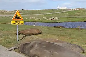 The terrain is black basalt overlain by treeless tundra similar to Iceland. Kerguelen supports large colonies of penguins and other seabirds, and seals including elephant seals, but there are many introduced species. Rabbits, sheep and reindeer all churn up the tundra, rats prey on ground-nesting birds, and salmon have driven out any native river fish. The French staff therefore enjoy fresh meat and grow their own vegetables, but even they don't have a culinary use for the feral cats. There are no plans to eradicate the pests and remediate the habitat, and it may not be feasible. In spite of this the terrain is a
