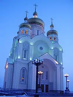 - 🌍 Cathedral of the Transfiguration (Spaso-Preobrazhensky Cathedral, Преображенский Кафедральный собор), Lenina St. Christianity is alive and well in Russia, as this golden domed church towering above Khabarovsk is evidence of. Only completed in 2004, at 83 meters it's the 3rd tallest church in all of Russia - inside it's not that impressive, just large. The monastery, or rather the Theological Seminary, right next to it is also worth a look a brief look from the outside. Opposite, facing the Amur is a war memorial "Вечный огонь" ("the eternal flame"), rather kitschy but has good Amur views. The whole thing is labeled as the Ploshchad Slavy or the Square of Glory.