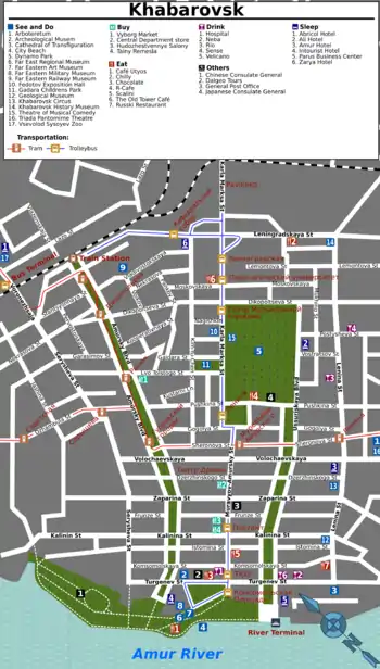 Khabarovsk or Chabarovsk (Russian: Хаба́ровск, khah-BAH-ruhvsk) is a city on the Amur river in the Russian Far East, near the Chinese border. Often overlooked due to its proximity to Vladivostok, Khabarovsk could easily be a highlight in the long line of predominately dull cities along the Trans-Siberian Railway. But while most cities look their best when the sun is out, in few is the effect as profound as in Khabarovsk – attractive parks, beaches, outdoor beer tents with live music, and classic architecture await if the weather gods favour you. Even if you are unfortunate, it's not a loss to go indoors: the city also houses some of the best museums east of Moscow.