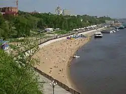 - 🌍 City Beach (Хабаровский пляж). Pictured on the right, the beach on the River Promenade just below the cathedral is hugely popular with pedestrians on warm summer days and packed with sunbathers — so much so that it's easy to forget you are over 300 km away from the nearest piece of coast. It is possible to take a quick dip, but stay very close to land as the current is strong, and keep in mind there are old world Chinese and Russian industries upstream. Usually there are some inflatable slides set up for kids.