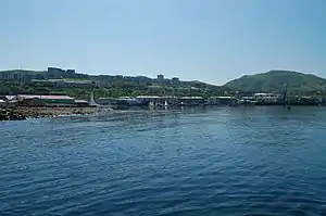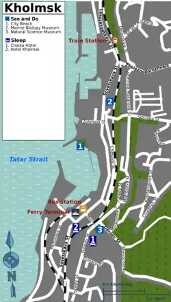 Kholmsk (Russian: Холмск, khohlmsk; Japanese: 真岡, mah-oh-kah) is a port town in Sakhalin Oblast facing the Tartar Strait, with a population of some 35,000 people. An utterly drab city, the only reason to visit here is the ferry connection to the mainland.