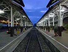 As of 2018 the main railway station is being rebuilt and trains stop instead at a temporary station along the same line 3 km (1.9 mi) to the south. A 30-minute walk to the center, or else taxis are available.