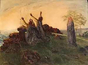 Brigid was a Celtic goddess cloaked in glittering legends. Her many powers, attributes and miracles particularly centred on fire, and on fertility of plants, farm beasts and humankind. St Brigid (451-525; in Irish Naomh BrΓd) is said to have founded an abbey at Kildare in 480, and in hagiographies she strongly resembled the pagan Brigid: clearly the old folk tales were Christianised and grafted onto her. And somebody established an early religious centre here, so we may as well credit St Brigid. She's said to have founded it by an oak tree, hence Cill Dara or "Church of the Oak." She wouldn't need to look very far, as in her days the western lowlands of Europe were carpeted in oak forests, and daire or -derry is a common placename element.
