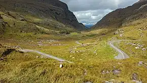 - π Gap of Dunloe is a scenic mountain gorge west of the lough, created when a glacier broke through and bruised its way north. It's flanked by Macgillycuddy's Reeks to the west and the Purple Mountains east. Tour groups transfer to pony carts for the ride up. The lane traversing the gorge is a public road so you may drive it, but it's very narrow, and cars come into conflict with other cars, bikes, more cars, pony carts and yet more cars.