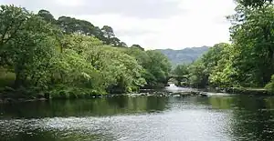 - Lakes or loughs: the one next to town is Lough Leane, the largest and lowest of the three. The name means "lake of learning" probably referring to its monasteries. For the visitor it's the lake of viewing, as it creates an unbroken vista west towards the mountains. South is Muckross or Middle Lake, smaller but 75 m deep, as it fills a glacial scour. A pleasant hike circles it, crossing by old stone bridges. Further southwest is Upper Lake: the fall on the river is only 2 m so small boats can travel between the lakes; perhaps the supposed lake monster does likewise. The river flows into Muckross Lake at Meeting of the Waters, where there's a weir and a back-channel direct into Lough Leane.
