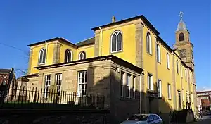 - π New Laigh Kirk (C of S) on John Dickie St was built in 1802. Its predecessor of 1750 carried a legend that it would collapse upon its congregation, so when in 1801 a piece of plaster happened to fall, there was a chicken-licken stampede for the exit that cost 30 lives.
