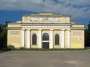 - 🌍 Barracks of the 146th Tsaritsyno Infantry Regiment (Казармы 146-го пехотного Царицынского полка), Karl Marx Ave., 2-3. At the end of the 18th century, a cotton manufactory was opened in Yamburg, and with it, two buildings of the Gostiny Dvor, where it was supposed to trade the products of this manufactory. But it soon became clear that this was too large-scale an undertaking for a small town, and Gostiny Dvor was simply not needed. In the 1830s, it was redesigned to accommodate the officers of the regiment quartered in Yamburg; at the same time, according to the “model project” of the famous St. Petersburg architect A.E. Staubert between two semi-circular buildings, an indoor arena was built. Several additional buildings were erected in the neighborhood. The result was a noble classicistic complex, which has been well preserved to this day. The east wing and arena are now used as a college and a children's sports school, which makes these parts look better than the half-abandoned west wing. The view of the complex from the avenue, however, is somewhat spoiled military memorial "Glory to the Heroes", which has been here since the time of the Civil War, and was finally formed after the Great Patriotic War.