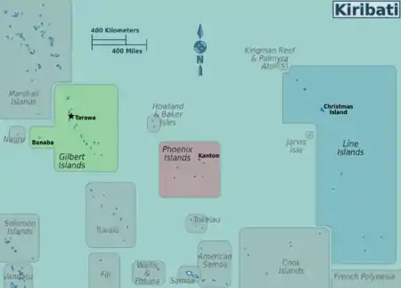 Except for Banaba (Ocean Island - 6km²/2.3 sq mi, population c. 300), all the main islands are in one of 3 three groups: the Gilbert Islands, the Line Islands, and the Phoenix Islands.