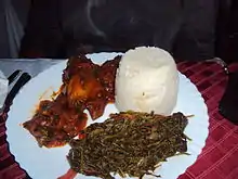 A traditional Kenyan meal of ugali, greens and Kienyeji chicken, served at a hotel in Kisii
