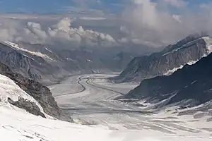 - Jungfraujoch is the icy viewing point at the top of the railway, see above for prices. The train also pauses for 5 minutes in a viewing gallery part way up, where you see the house-sized ice lumps of the glacier. At the top there's a cafe, restaurant and shops with prices to match the altitude. The tour route leads you up to an observation deck, then through ice tunnels with sculpture. The view south is the Great Aletsch Glacier, which descends the Massa Valley towards Brig. This is in retreat but still about 22 km long, 2 km at its widest, and almost 1 km deep. It's possible to ski or hike down the glacier but you must have a guide, decent weather, and onward transport from the glacier foot. In summer you can hike from Jungfraujoch to the refuge of Mönchsjoch Hut. Reaching the summits however is full-on mountaineering and beyond the scope of this guide.