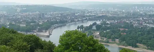 Koblenz was the capital of the Rhine province of Prussia. Located in the confluence of the Moselelle and Rhine rivers, and watched by the gigantic Ehrenbreitstein fortress on top of the eponymous hill, the city was the battleground of multiple wars between France and the German countries between the 17th and 19th centuries.