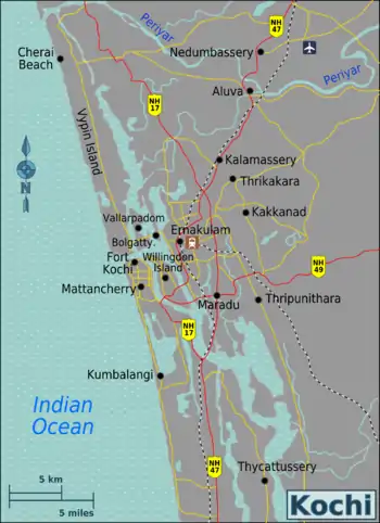 - Aluva — the second largest town in the Kochi urban area, famous for its Periyar river banks. Kochi International Airport is nearby.