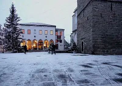 The centre of the old city is Tito Square (Titov trg), an austere piazza surrounded by The Praetorian Palace, Loggia, Cathedral of the Assumption, Campanile, Foresteria and Armeria. From here, the cobbled Čevljarska ulica leads south to the Prešeren square with the De Ponte fountain and the old town entrance Muda gate, Kidričeva ulica leads west to the Marina, the old salt warehouse named Taverna and the Carpaccio square.