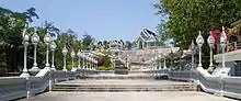 - 🌍 Tiger Cave Temple (Wat Tham Sua) (take the road to the airport and turn left/north before you get to the big shopping malls; you should be able to see a big Buddha on the mountaintop; it should cost no more than 200 baht by taxi). One of the most famous temples in southern Thailand, built into a mountainside about 3 km north-northeast of Krabi Town, and swathed by tropical forest.The first thing you see as you walk into the temple compound is a huge stupa on the right (closed for reconstruction in late 2016), but this isn't the Tiger Temple. The temple itself is set into the base of the karst cliff which rises sheer from the forested plain: follow the ramp into the hall. Buddhas line the cliff overhang, then a few narrow steps lead into the cave shrine itself. The temple was only founded in 1975, yet already there are several contradictory explanations of how the tiger was involved.If you have at least an hour and feel fit, the first stairway beyond the temple has 1,237 steps to the top of the mountain, where there are great all-round views, and another large Buddha shrine. (This too is sometimes mistaken for the "Tiger Temple".)Otherwise, continue through the monks' village to the second stairway, which offers an easier climb into a scenic valley (called "Wonderland") with several smaller cave shrines.Signs warn you against feeding the monkeys, right next to signs advertising monkey food. Follow the warnings not the adverts: the monkeys are cute from a distance but utter pests close-up, and if they bite you (often without provocation) then you need rabies vaccine immediately.