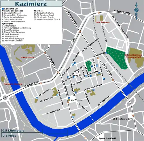 - 🌍 Centre for Jewish Culture (Judaica Foundation), ul. Meiselsa 17, ☏ +48 12 430 64 49. Exhibitions, concerts, seminars and workshops on Jewish culture. There is also a cafe (with roof terrace!) and a great antiquarian bookshop located in the basement.