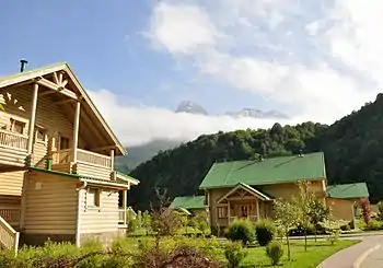 - Rai Ski Domik, Pereulok Zaschitnokov Kavkaza 45. An Alpine-style guesthouse having 10 comfortable rooms, with a Caucasian restaurant, karaoke and free wi-fi. Price vary from the season from 1,900 RUR (summer) to 3,500 RUR (winter skiing season) for a double room per night.