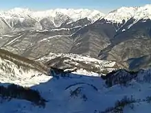 Krasnaya Polyana (Russian: Красная Поляна, KRUSS-nah-yah poh-LYAH-nah ) is one of the most expensive and popular (mainly at national level) winter ski resorts in Russia. Located 40 km away from the Black Sea coast and from the city of Sochi, it is, nevertheless, included in the Adler District of Sochi.