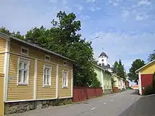 The old town is a lovely preserved grid of wooden houses on a hill slope towards the bay cutting the town in two. There is also a beautiful stone church with a separate wooden tower. There's also a little, narrow alley called Kattpiskargränden/Kissanpiiskaajankuja (Cat spanker's alley), which is among the most photographed street signs in Finland.