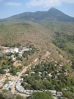 Fifty kilometres southeast of Bagan in Central Myanmar at the base of Mount Popa is a solitary peak with a temple/shrine topped by gold stupas.