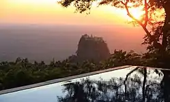 - 🌍 Popa Mountain Resort (1.5 km before the pilgrim village on the main road), ☏ +951 399 334, +95 2 69168, +95 2 69169, +95 2 67140, rsvpopa@myanmar.com.mm. This resort is on the side of Mount Popa, overlooking the surrounding area and the cliff with temple/shrine. A beautiful complex with an excellent restaurant featuring Burmese and European dishes. The bungalows are better than the dated rooms. US$45-110, menu US$12.