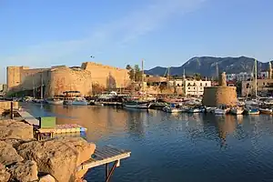 Kyrenia (Greek: Κερύνεια Keryneia, Turkish: Girne) is the chief port and tourist resort of Northern Cyprus. Its old centre is dominated by the castle over the harbour, built by the Venetians in 1540. The city in 2019 had a population of 45,881, with as many again in the resort strips that extend for 20 km on either side.