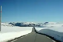 - The mountain road to Aurland, close to Flåm. This road reach an altitude of 1306 m (4285 ft). The road is named the snow road because snow lies beside it throughout the summer. Awesome view over Aurland.